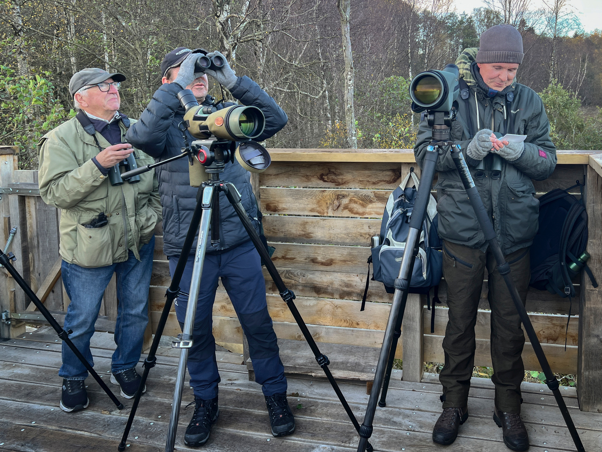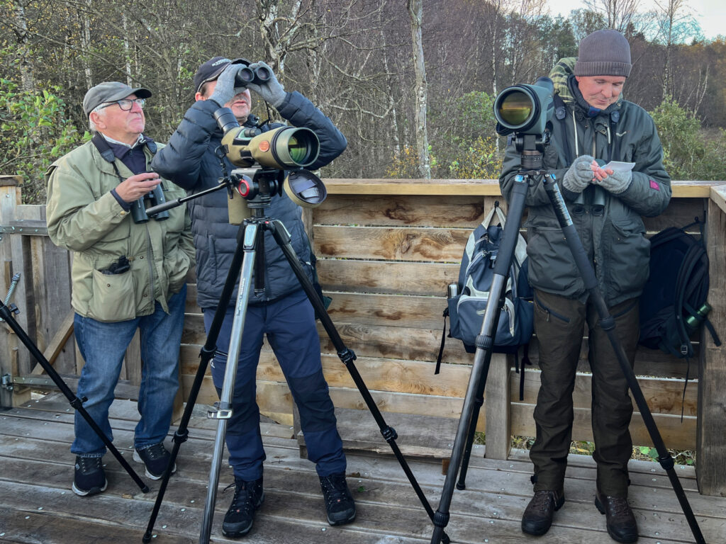 Totalt var vi denna gång 10 personer som deltog under några timmar i Hjällsnäsvikens fågeltorn. Vi hade en behaglig morgon eftersom det var nästan helt vindstilla och varmt för årstiden. Precis som tidigare morgnar denna höst hördes vattenrall i vassen.